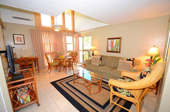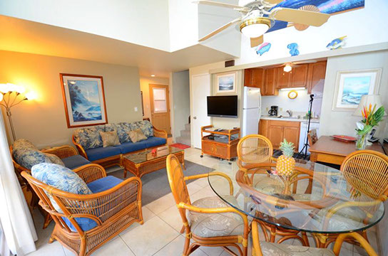 Condo B7 is a 2-bedroom, Superior Ocean View townhouse style condo on 2nd level at Kihei Sands Condominiums. It has 2 twin beds in main-level bedroom; King bed in upstairs bedroom and non-sleeper sofa in living room.